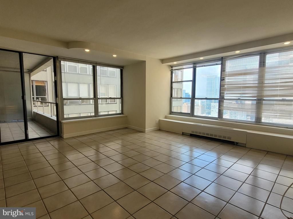 Spacious two bedroom, two bathroom residence showcasing northern skyline views on a high floor of The Dorchester. This sun-soaked home features a spacious great room with ample room for living and dining, an open kitchen, and incredible natural light from two walls of oversized windows. The generously combined living/dining area is perfect for entertaining and enjoys access to a large private balcony boasting northern city views. The open kitchen has excellent cabinetry space, stainless steel appliances, and a separate wet bar with mini fridge. The spacious primary bedroom has multiple built-ins, a wall of windows, walk-in closet, and ensuite bathroom with a stall shower and single vanity. Adjacent, there is a second bedroom featuring two wall closets and more built-ins that enjoys use of a full hall bathroom with single vanity, shower tub, and laundry closet with stacked washer/dryer. The home has excellent closet space and tile floors throughout. Residents of The Dorchester enjoy a twenty-four-hour doorman and all utilities included in rent except cable TV. Use of the building's state-of-the-art fitness center, seasonal rooftop pool club, and valet parking in the building's underground garage are available for an additional fee, subject to availability. No pets permitted. Rittenhouse Square is ranked the 6th best neighborhood in North America with 175 restaurants and 199 retailers within a three block radius. The Dorchester is within walking distance to the Market Street office corridor, The Avenue of the Arts and University City. 30th Street Station and Philadelphia International Airport are a short commute.