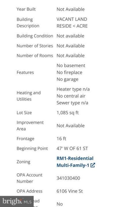 This land located at 6106 Vine Street , Philadelphia, PA 19139 is currently listed for sale with an asking price of $59,000. The property has approximately 0.02 Acres. Vine Street is located within the PHILADELPHIA CITY school district. Search Philadelphia real estate on rslattery.reexcelpros.com today.